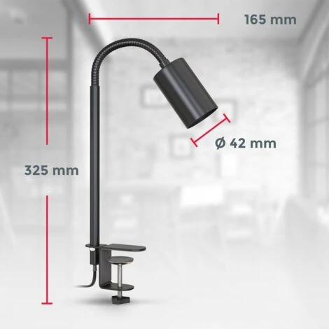 Luminaria de pinza metálica con una altura total estirada de 477 mm (altura de trabajo 325 mm), con una proyección de 165 mm. El cabezal de la lámpara mide 42 mm de diámetro.