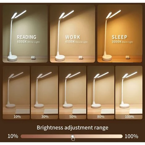 【Tres modos de luz】 Nuestra lámpara de escritorio proporciona tres modos de luz de 3000K, 4500K y 6000K, el brillo se puede ajustar al tacto y se adapta fácilmente a varias escenas de estudio, trabajo, lectura, vida, etc.