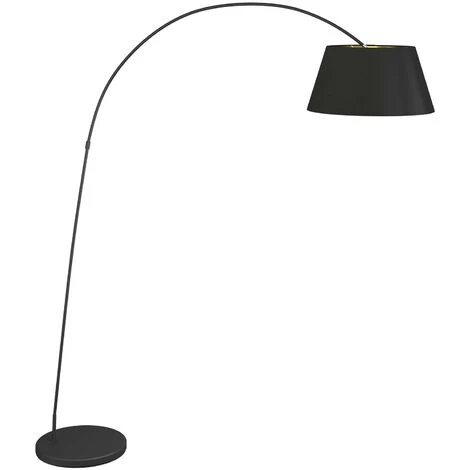 Elegante lámpara de arco Esti con pantalla de tela negra y dorada Esti es una lámpara de pie, que puede combinarse muy bien con los estilos de vida modernos. La base de la lámpara y el marco están hechos de metal relativamente estrecho, mientras que la pantalla redonda está hecha en tela. Esta pantalla es negra en su zona exterior y dorada en el interior, por lo que se ha adoptado una tendencia que en la decoración de las salas de estar en otras estancia y que no se limita sólo a las lámparas. La luz tiene un efecto es particularmente efectivo, ya que la luz emitida se tiñe de un tinte dorado cálido y lujoso que procede del interior de la pantalla. Aparte de eso, los dos tonos dan un contraste realmente interesante. Las lámparas de pie curvada so, en general, muy elegantes, pero también son populares porque pueden resolver maravillosamente un problema de espacio en la sala de estar y la combinación de la base de la lámpara y la zona del sofá ya no es un problema a partir de ahora. Con la forma del arco, el pie se puede colocar afuera y la luz sigue incidiendo donde es requerida.