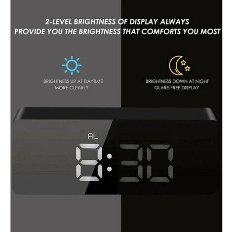 【Brillo ajustable】Sentido visual claro y cómodo, se oscurece automáticamente a las 6:00 p.m. Cuando se conecta con un cable USB, la luz LED siempre estará encendida. Cuando se usa el modo de batería, la pantalla se apagará automáticamente en 10 segundos. Puede activar la pantalla por voz o presionar cualquier tecla para encender la pantalla. Mantenga presionado LIGHT/SNOOZE en cualquier modo durante 3 segundos para apagar la pantalla.
