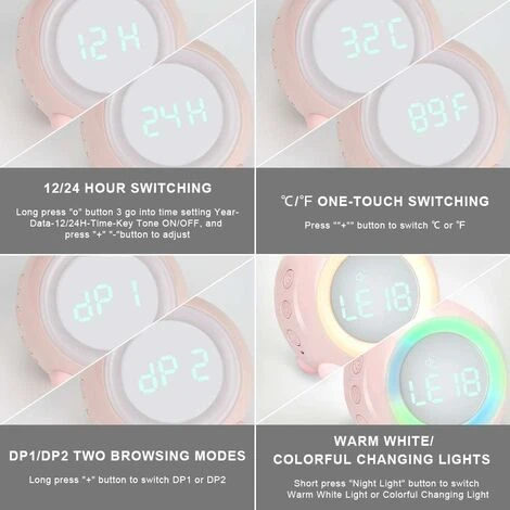 - Luz nocturna LED: – El reloj despertador junto a la cama se puede usar como luz nocturna en iluminación degradada o modo de cambio de color. Pulsa el botón inferior izquierdo para activar la función de luz nocturna y cambiar de modo. La luz se oscurecerá con el tiempo en el primer modo. En el modo de luz de color Segundo), puede leer más de 10 hermosos colores.