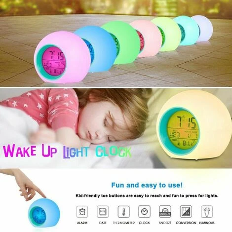 -Retroiluminación de 7 colores -6 tonos de llamada -Función Snooze -Aspecto compacto y bonito -Material apto para niños -Pantalla LED -Regalo ideal -Snooze sincronización de funciones -Función de temperatura -Mejora el sueño