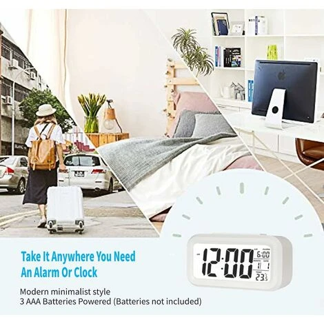 Capteur de lumière intelligent : l’horloge numérique dispose d’un appareil à cristaux liquides à contrôle optique intégré, le rétroéclairage LCD s’allume automatiquement lorsque la pièce ou la circonstance devient très sombre (Remarque : cette fonction doit allumer le bouton du capteur pour fonctionner).